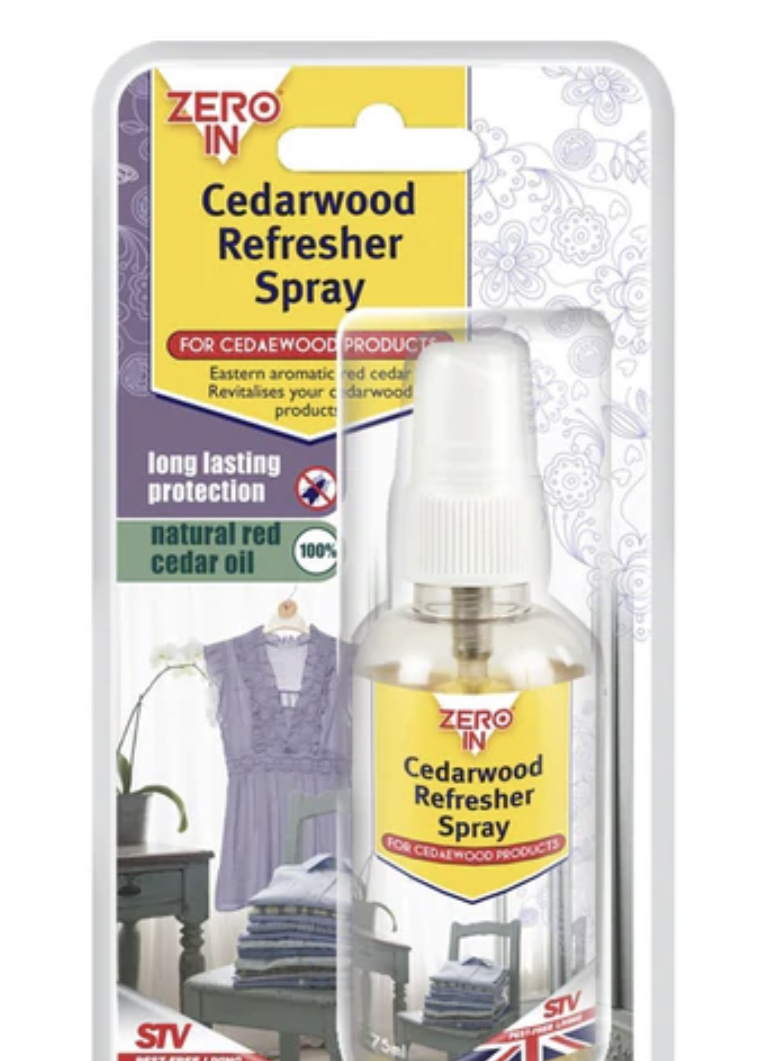 Zero In Cedarwood Refresher Spray Natural eastern aromatic red cedar spray refreshes cedarwood products and moth proof clothes covers Long-lasting fragrance in atomising spray dispenser No more mothball odours! 75ml